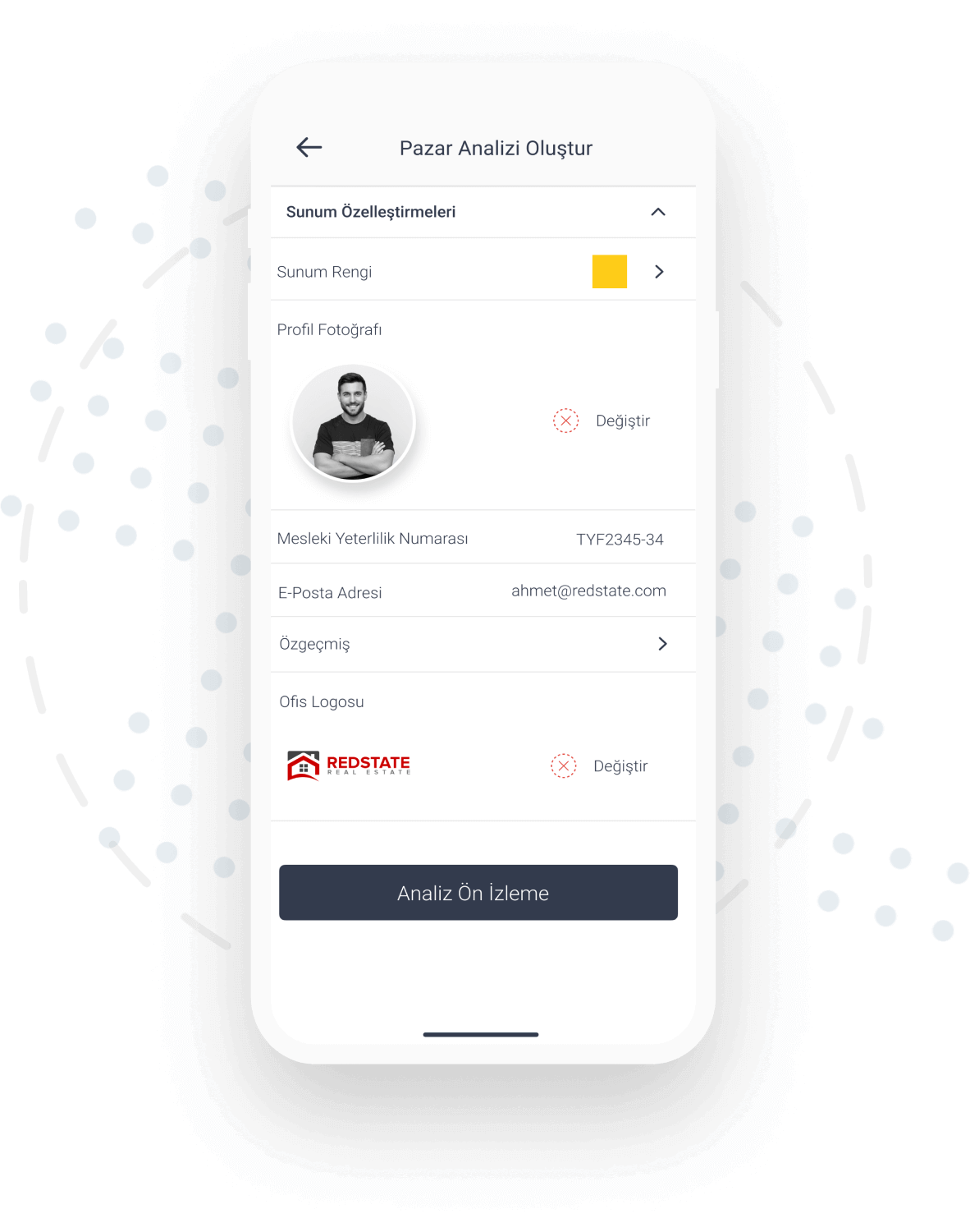 Sunum otomatik olarak kendi marka renklerinle oluşacak, sen istediğin rengi seçebilir, profil fotoğrafını, ofis logonu ve özgeçmişini güncelleyebilirsin.